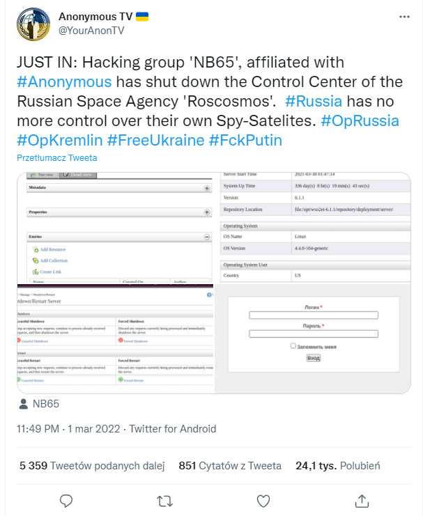 Dodatkowym czynnikiem mamy tutaj niezależne od Ukrainy organizacje (takie jak np. Anonymous) które także prowadzą antyrosyjskie działania. Przykładem niemal 100% fake newsa jest informacja o odcięciu Rosjan od Satelit szpiegowskich – dostanie się do systemów kontrolujących tak ważne dla spraw bezpieczeństwa państwa systemy za pośrednictwem Internetu jest po prostu nierealne.